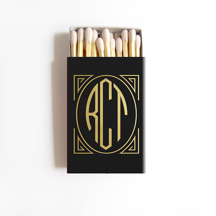 Elevate your event with these Art Deco matchboxes, featuring luxe gold foil on sleek black.