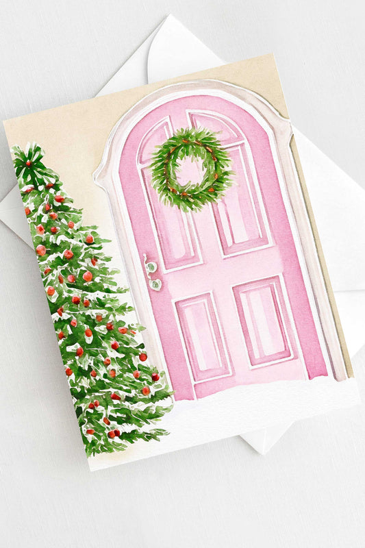 Pink Door Tree Christmas Card Watercolor Holiday H020