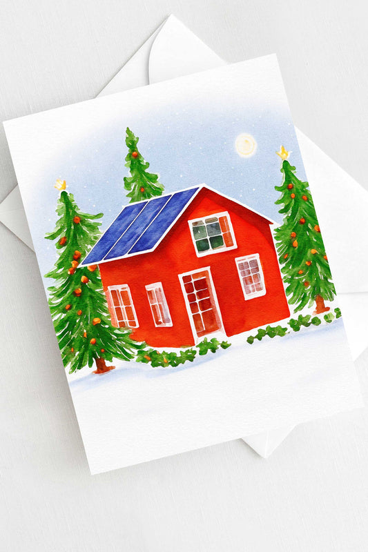 Solar Panel Red House Christmas Card Watercolor Holiday H035