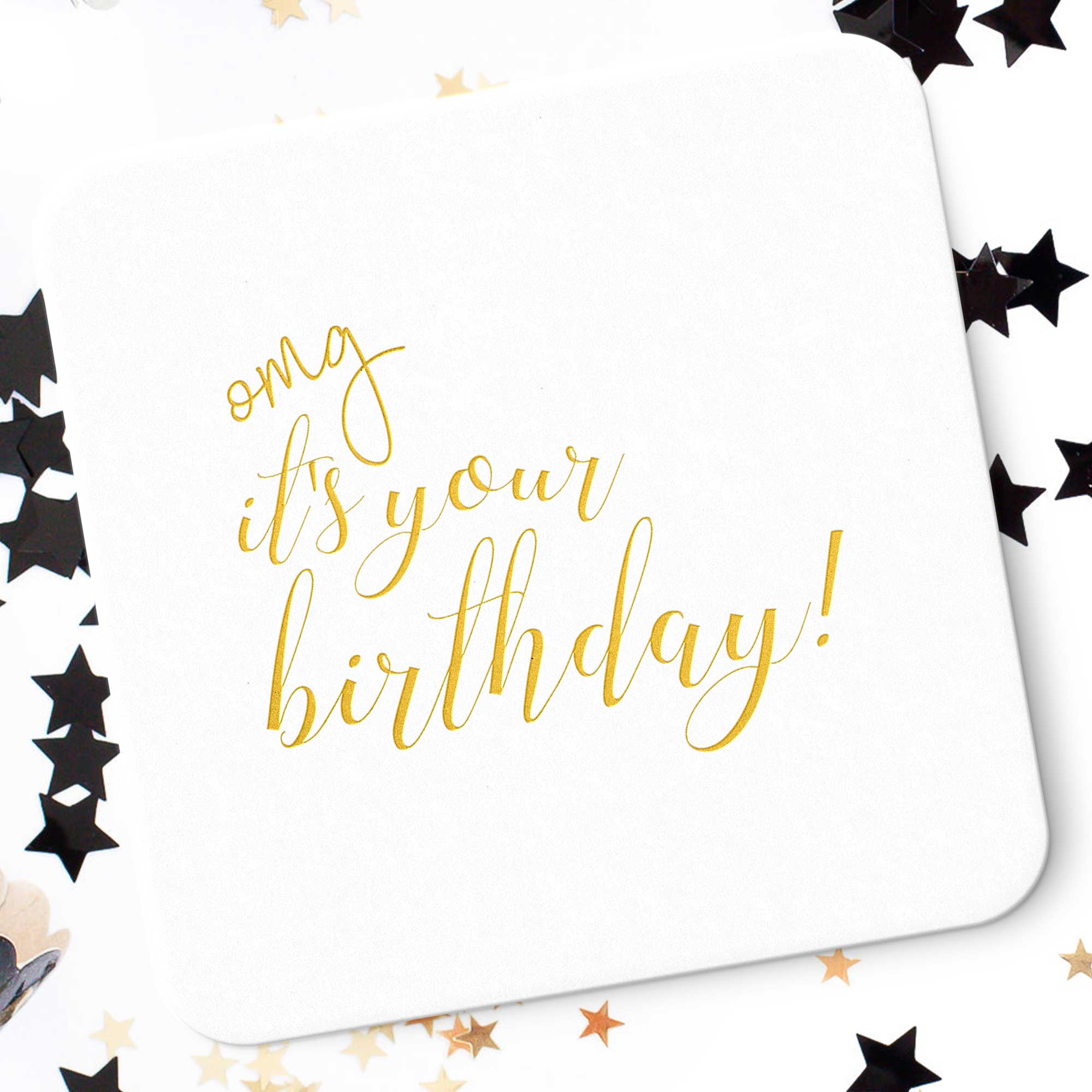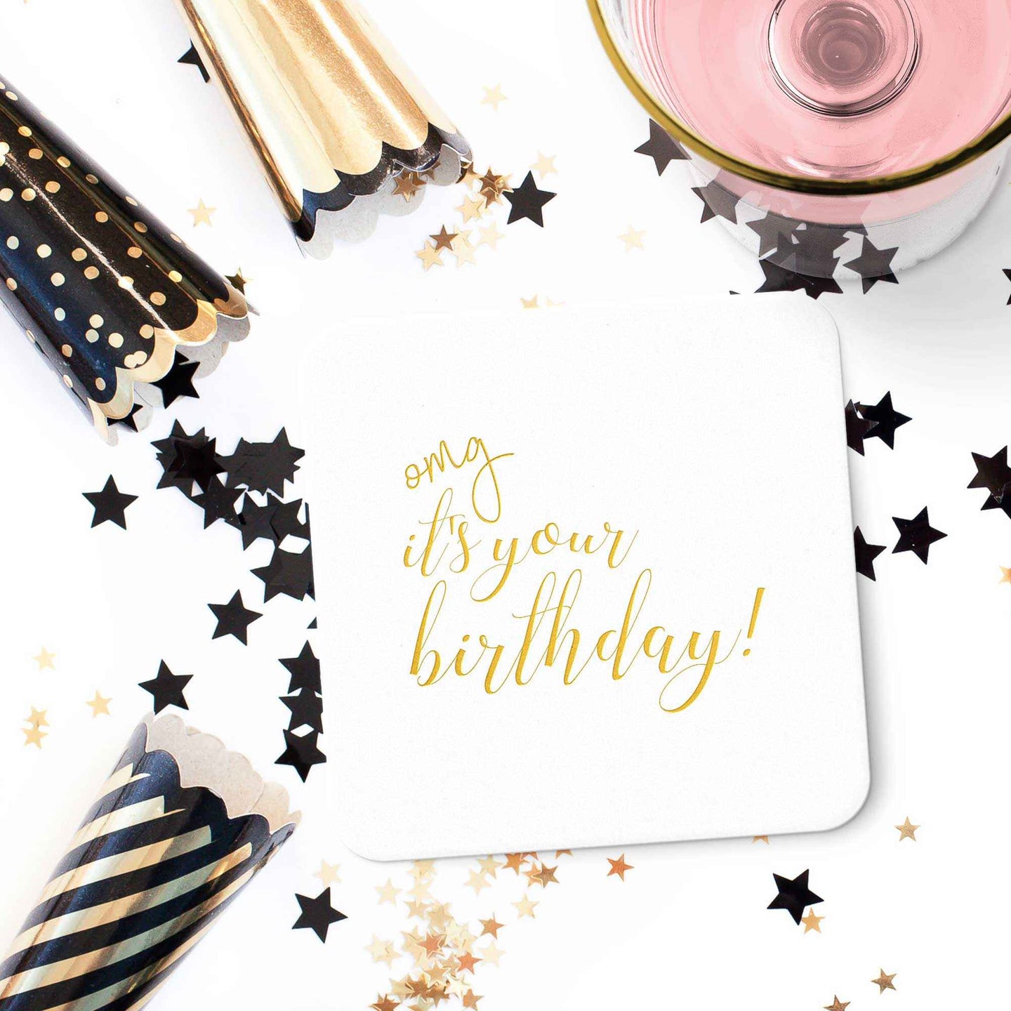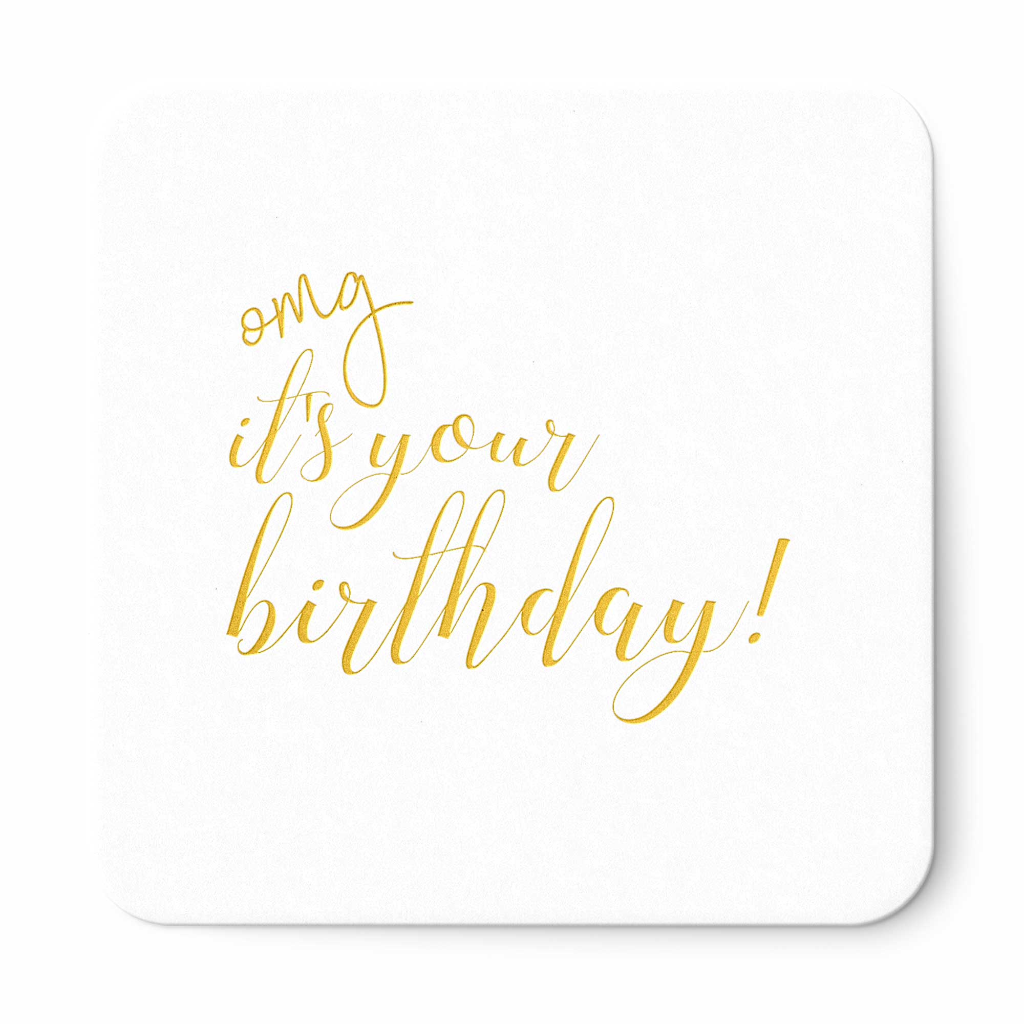 When birthday drinks are in order, pair them with a fun OMG It's Your Birthday coasters. The beautiful coasters are foil letterpressed in gold foil on a ivory coaster and ready to ship. Add them to your bar for a fun surprise.