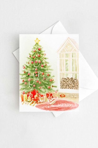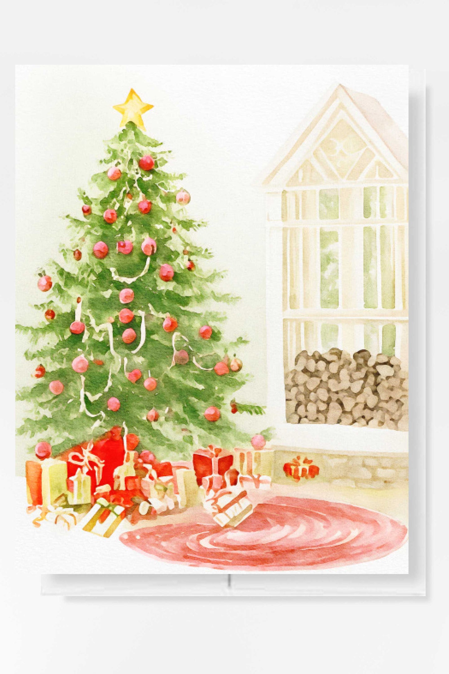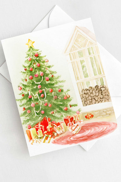 Christmas Tree and Wood Stack Holiday Card Watercolor H034