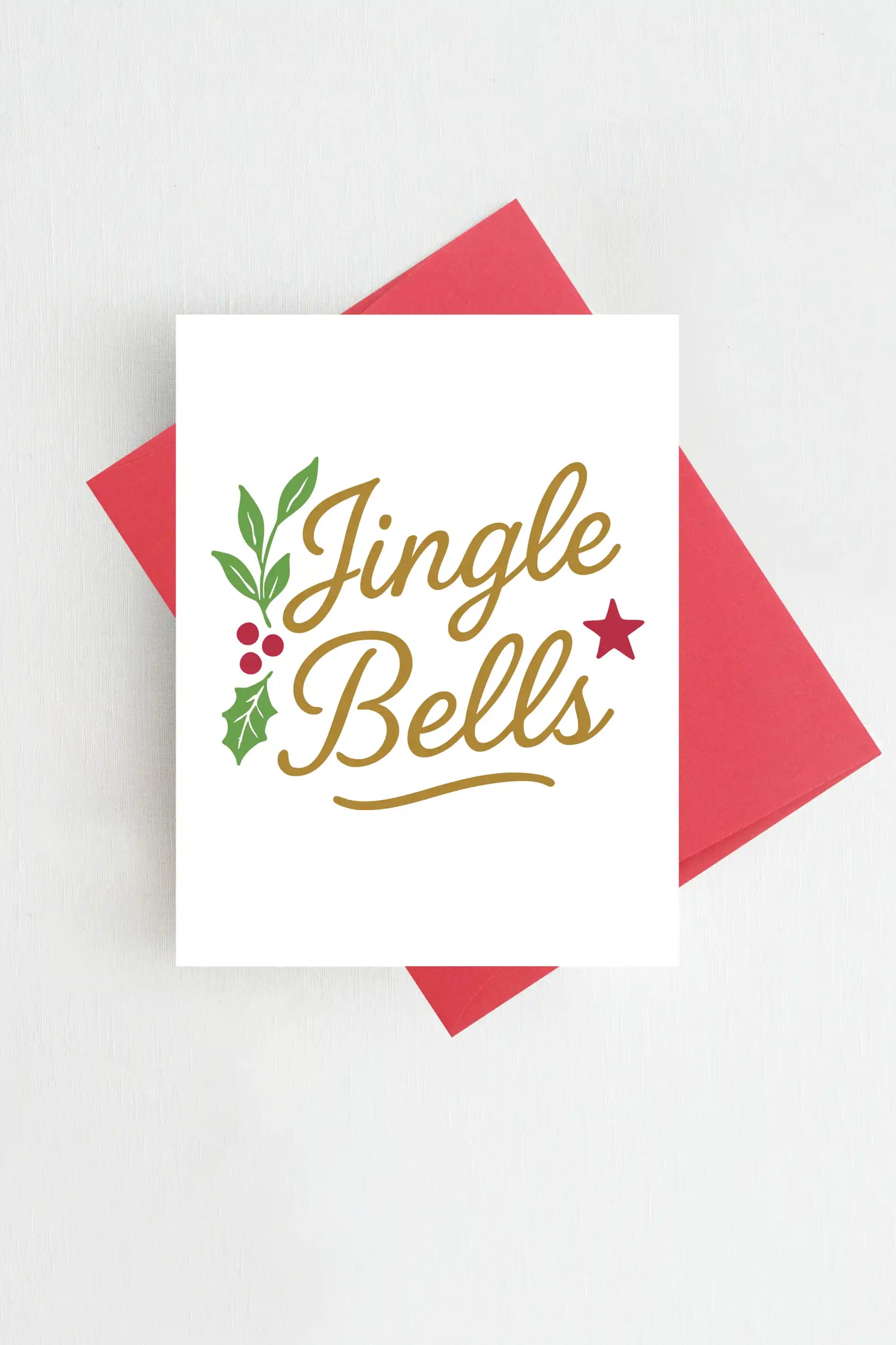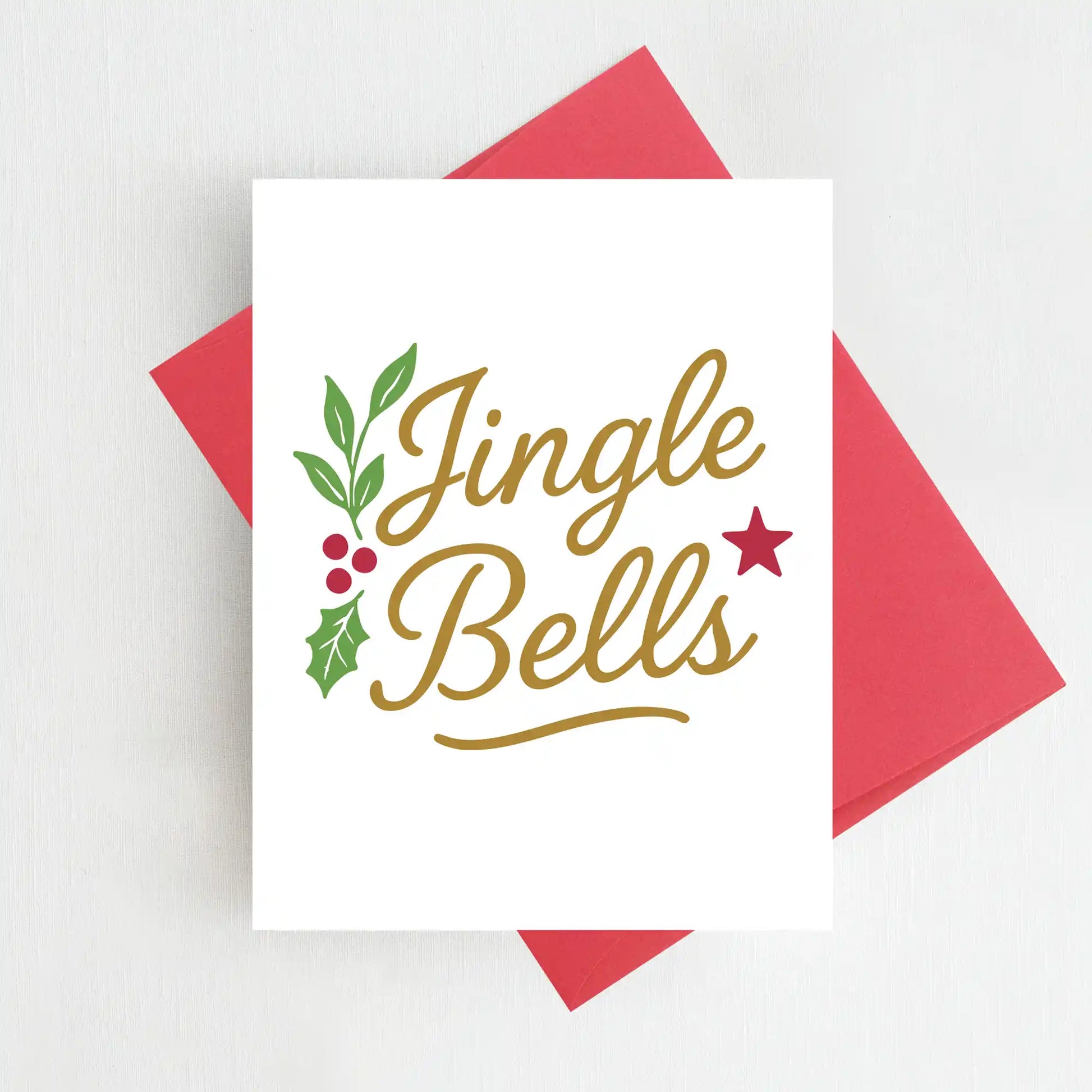 Bring holiday cheer with our Jingle Bells card! Featuring festive gold script with holly leaves, berries, and a red star, this classic design is perfect for sending joyful wishes to family, friends, or loved ones during the Christmas season.