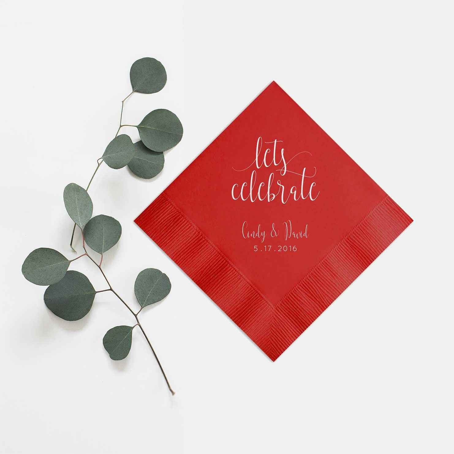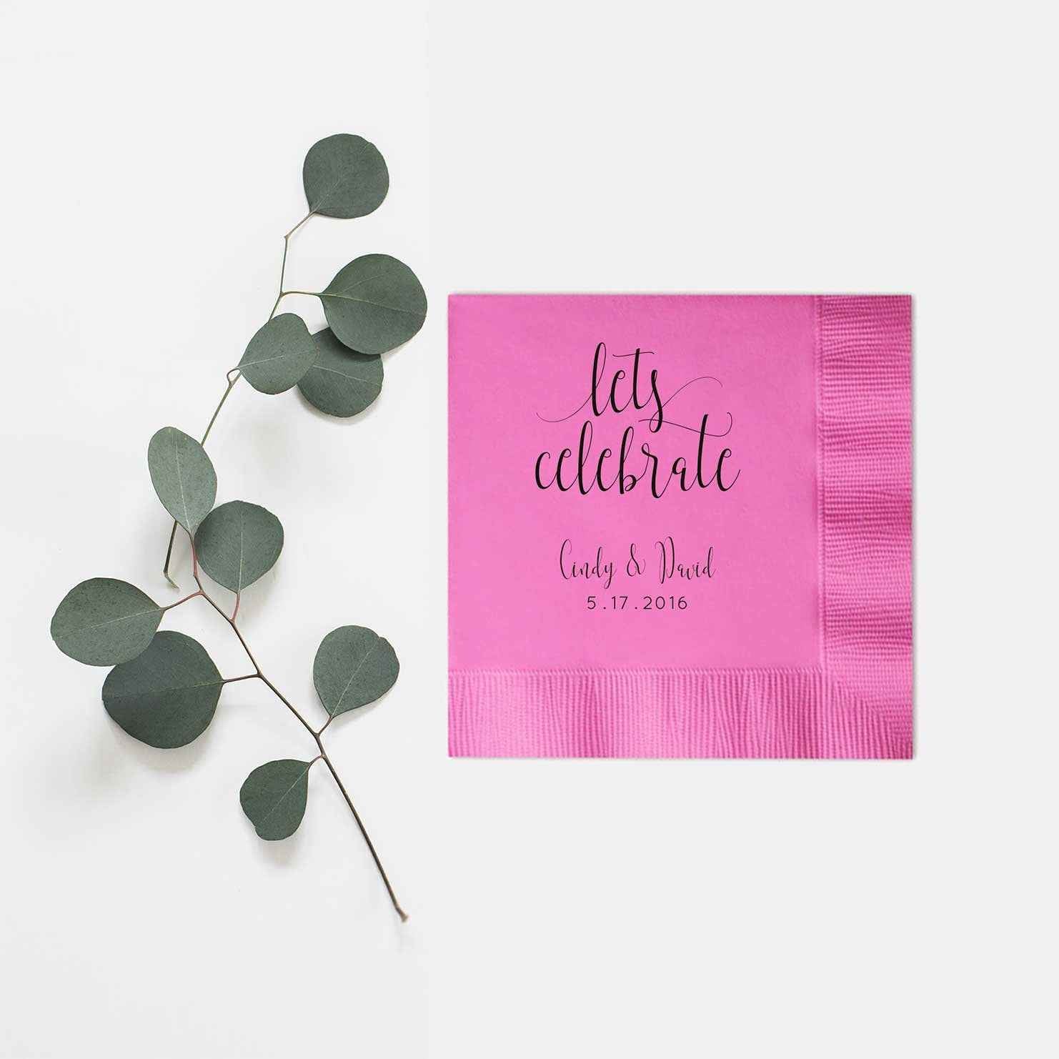 Need an extra special finishing touch for your wedding day? Why not charm your wedding guests these beautiful Let's Celebrate personalized wedding napkins. The napkins are beautifully foil stamped with the names of the bride and groom and wedding date. These Let's Celebrate personalized wedding napkins napkins are a wonderful addition to any wedding, anniversary, rehearsal dinner or bridal shower.