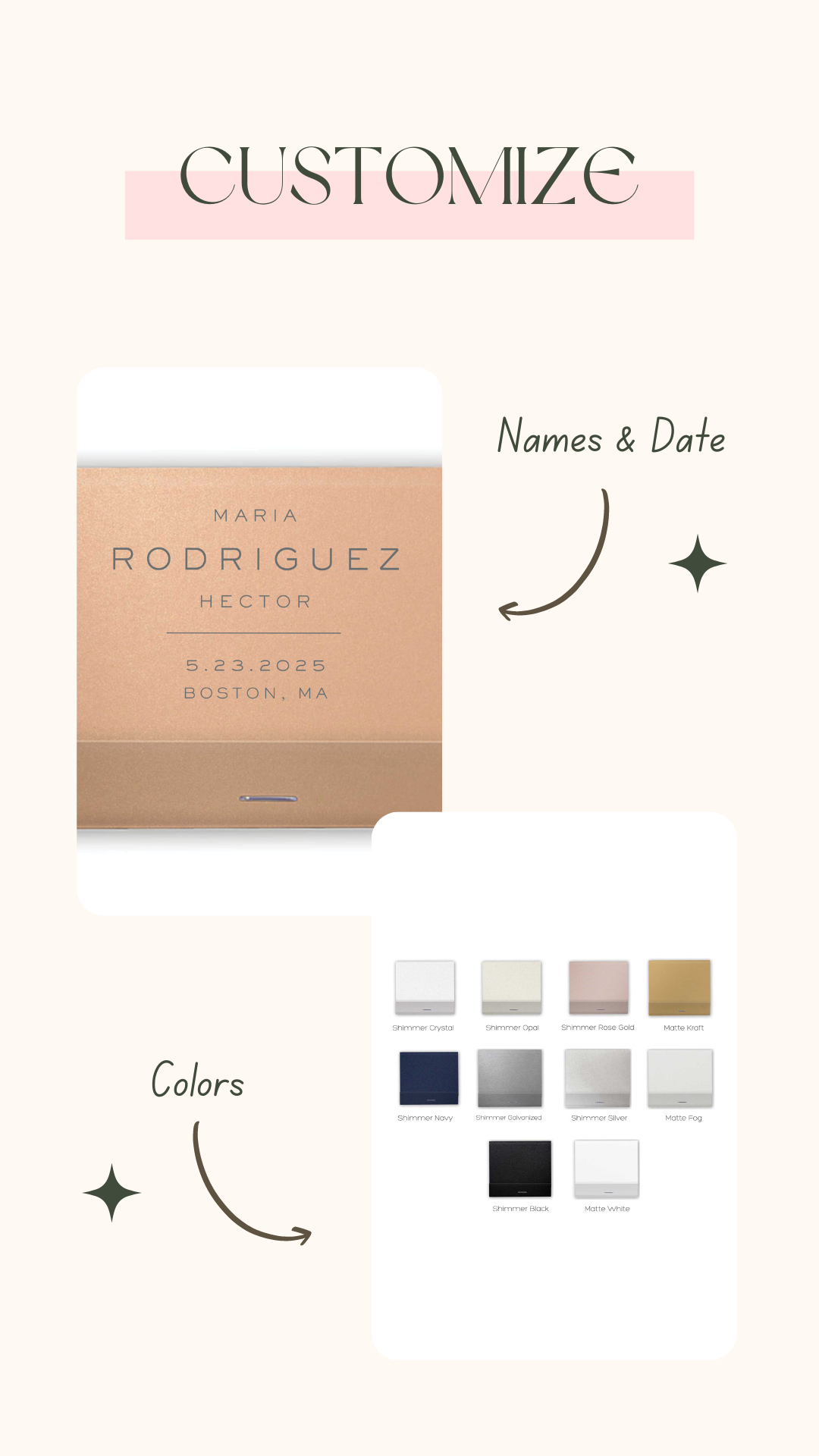 Light up your wedding day with these fabulous Minimalist Wedding Matches! Ignite your 'I Do's' with our personalized matchbook favors designed with your wedding colors and personalized with the wedding couple’s names, wedding date and location. Whether you're using them to create a romantic spark at the altar, a dazzling send-off, or for a cigar bar, they'll make your wedding day one to remember!