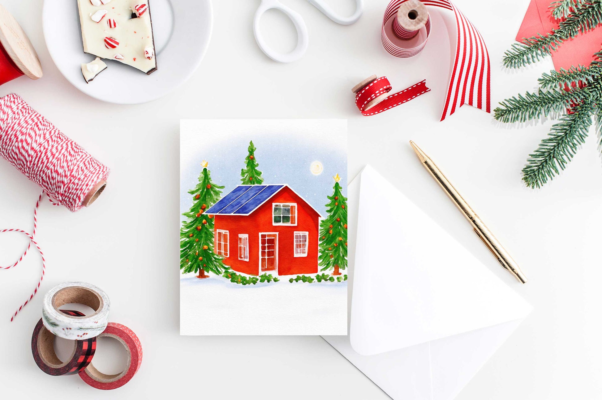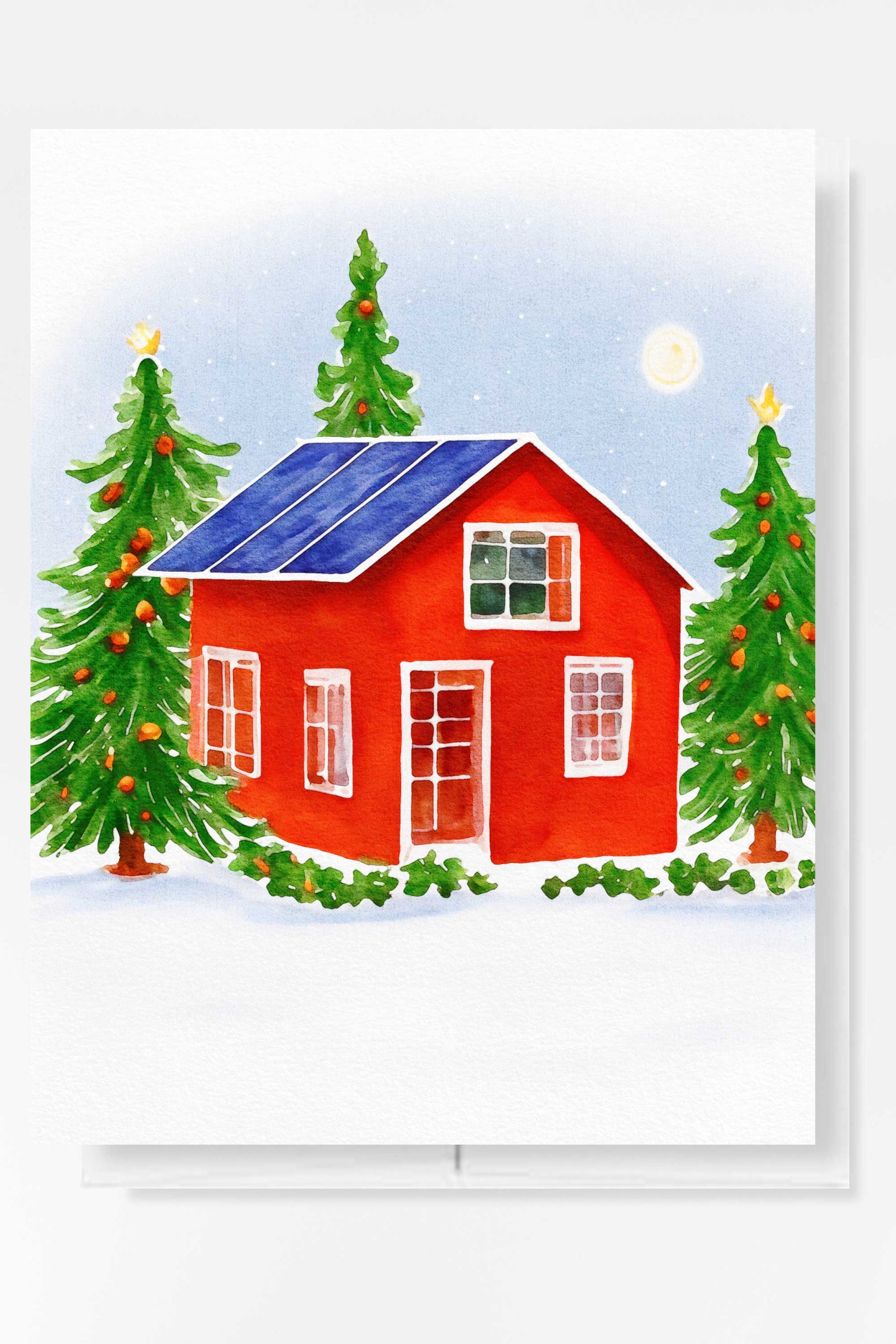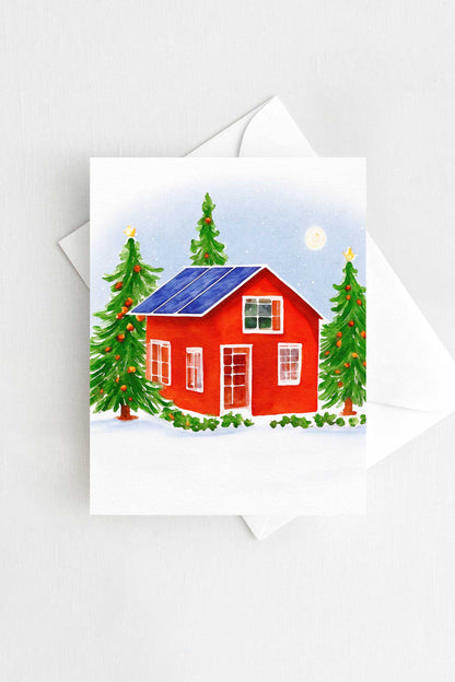 Solar Panel Red House Christmas Card Watercolor Holiday H035
